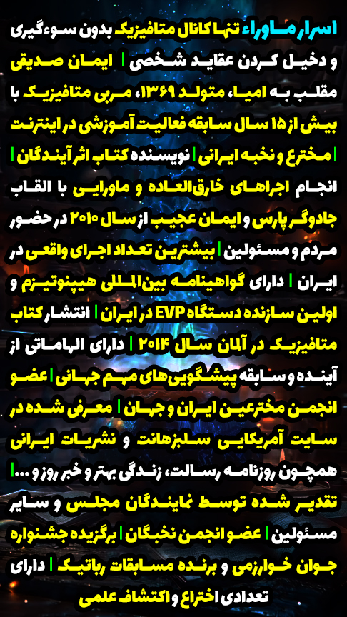 در زمینه موکل، برونفکنی و احضار، من برای اولین بار در ایران، افشاگری های مهمی انجام دادم اما بازخوردی که از اکثر مردم گرفتم باعث شد متوجه بشم که فعلا مجبورم فقط 10 درصد کشفیات خودمون رو بگم چون ذهن ها هنوز آماده درک رازهای بیشتر نیست.